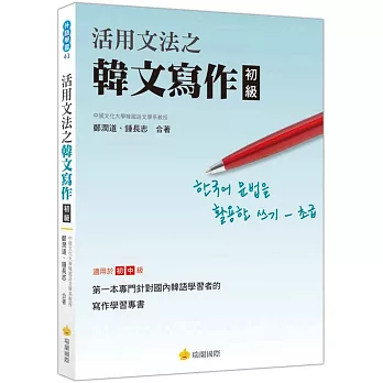 詳細資料ISBN:9789571359847 規格:平裝 / 232頁 / 25K正 / 14.8 X 21 CM / 普通級/ 單色印刷 / 初版 出版地:台灣 內容簡介史上第一本!專為臺灣人設計的超強文法整理 專為初級程度設計,50個最容易混淆的文法盲點! 無論聽說讀寫,就像真正的韓國人一樣流利、道地! 想看韓劇不用看字幕,了解RUNNING MAN口語化的爆笑臺詞, 聽K POP立刻懂歌詞,跟偶像歐霸近距離聊天更自然, 你最需要的,就是這本書! ◎連韓國人都常搞不清楚的區分使用 助詞、語尾、介詞,詳細分解使用時機,清楚辨認! ◎很像但是不一樣的小差異 同一個句子可用的文法很多,該用哪種最貼切? ◎臺灣人不太容易理解的韓語中級文法 語氣曖昧的文法,就用中文的方式理解吧! ◎不解釋你不會懂的相似詞彙 單字意思都一樣,哪種情況下用最適當? ◎學韓語一定得知道的韓語常識 整理好基本常識,打好基礎才是最扎實的學習!名人推薦 超過4萬名粉絲熱情支持! 學了兩年多韓語,看過許多韓語文法書,這本內容真是令人激賞!一直以來混淆的文法觀念,看完本書後有一種恍然大悟的感覺,如果可以按讚,我應該會按到手軟吧!我相信即使是初學者,也能充滿信心和耐心地把它讀完!──楊珮慈 本書文法整理得非常好,難以分辨的文法都詳細列表舉例,就連韓國人都不見得回答得出來的分別,也解釋得非常詳細,讓人一讀就懂!──PEY 以為懂日語,學韓語會很容易,卻發現雖然句子結構跟日語很相似,但有許多細節總是不太得心應手,用錯也不知道原因。但有了本書就不怕囉!一直混淆的地方用十分精簡的篇幅就清楚說明,相似用語還列表總結,一目了然,尤其「補充加油站」單元是我的最愛!──DADADISM 採用比較方式讓我更容易區分句型上使用的差異性,減少日後在學習上發生混亂的情況。了解課堂上學習的語法與韓國人平時說話時的不同之處,進而了解韓國人的口語習慣,希望自己未來說韓語能更像韓國人!──宇宙豌豆 書中寫出在學習文法上容易混淆的部分,像是中文裡的「不」,韓語裡面有很多種表達方式,書中也一一列出解釋比較,讓人輕鬆搞懂複雜文法。最棒的是,還介紹許多韓國人日常口語用法,這是一般韓語教科書中學不到的,讓我跟韓國人溝通時更道地,看韓劇或韓綜也能更快理解!──DORIS 對於韓語學習者來說,文法最困難的不是學習,而是「理解和使用」。書中使用大量例句和直白解說介紹易混淆的用法,並把其中差別分析歸納,還有實用的補充小單元。內容不含糊、不艱深,為您量身打造扎實的韓語真實力!──반자우 韓語學了一年多,對文法有一定認識,卻有許多相近文法,難以具體解釋之間的差別。本書透過「型態變化方式」和淺白文字,將相近文法進行比較和解說,重新整理韓語文法的正確用法。小單元也令我驚喜,學韓語從此變得更有趣!──IRENE TSANG 學韓語有一段時間,補習班進度都是一課一課地上,老師只針對課本內容補充,但常碰到中文意思相同、韓語用法不同的狀況,常常搞不清楚怎麼套用。本書整理歸納容易混淆的文法,並附上容易理解的例句,對我來說真是一大福音!──MEHEY LEE 學了兩年韓語的我,還傻傻分不清一些用法,本書編排簡單明瞭,解釋分析清楚,經過例句解說,輕鬆就了解如何使用各種文法,對韓語有與趣的朋友來說,是不能錯過的好書!──MINA一般韓語學習書不會詳細比較常用文法的不同差異,因此我也不知道該怎麼用才正確。本書清楚寫出使用差別,真的解決了我學韓語到現在的疑惑,是非常實用的一本書!──PENNY |