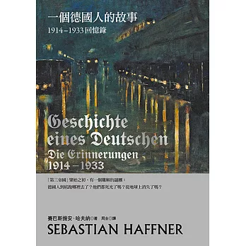搜尋參考資料: 1.https://www.taaze.tw/sing.html?pid=11100816020 一個德國人的故事 :1914-1933回憶錄(2017年新版). Geschichte eines Deutschen: Die Erinnerungen 1914-1933. 賽巴斯提安‧哈夫納. 周全. 左岸 ... 2.https://www.bookrep.com.tw/book/472/483/11826 「第三帝國」肇始之初存在著一個難解的謎團,那就是:德國人到底跑哪裡去了?難道他們死光了嗎?從地球上消失了嗎? 3.一個德國人的故事:1914~1933回憶錄(2017年新版) - 西洋史地 / 文化, 賽巴斯提安‧哈夫納(Sebastian Haffner), 9789865727567 4.https://www.kingstone.com.tw/book/book_page.asp?kmcode=2017430018879 一個德國人的故事:1914-1933回憶錄(2017年新版),作者:賽巴斯提安.哈夫納,出版社:左岸文化,isbn:9789865727567 5.www.eslite.com/product.aspx?pgid=1001141162594218 一個德國人的故事: 1914-1933回憶錄 (2017年新版),歷史,賽巴斯提安.哈夫納,左岸文化事業有限公司,「第三帝國」肇始之初 ...